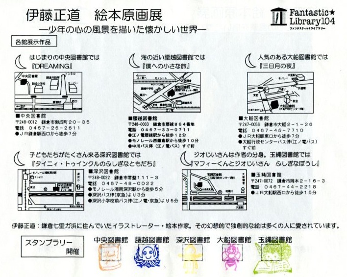 今回は地元作家の原画展を鎌倉市の5つの図書館で同時開催するという、素敵な企画です。最近、鎌倉市図書館は「学校がつらいなら図書館に来て」とのツイートでちょっと注目を浴びましたが、民間企業運営ではできない発想、地元への熱意があふれている感じです。昔も今も文士の多い地ですから、図書館は文化を護り創る場であって欲しいものです。