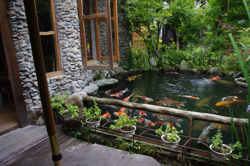 友永氏は庭仕事中でお見かけしただけでしたが、奥様とはお話しできて、ウッドデッキに設けられたガラスの大水槽に泳ぐ鯉や草魚を見せていただきました。山側にも水槽が段々になって設けられていて、自然の中の水族館といった様相で圧倒されます。友永氏の作品に魚頭の人間などもありますが(プリンプリン物語りにも出てきたっけ)お好きなようです。