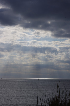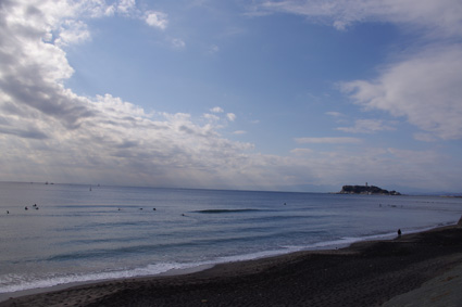 海岸線まで来れば、右に江の島とその先の富士山(この日は見えませんでしたが)、左に稲村ヶ崎とその先に三浦半島が見える絶景ポイントです。