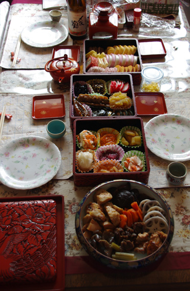 1)母が中心に前日までに作ったおせち料理を食べる。重箱も母の彫った鎌倉彫。今年の酒は大好きな〆張鶴にしました。