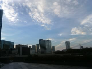 無念タクシーの行列をあとにして、駅舎の外に出ました。薄暮の時間、いまだ風は強く台風の爪痕も街中に見て取れます。しかし清々しさもあります。途中の牛丼屋でカレーを食べ、徒歩にて銀座へと向かいました。汐留の超高層ビル群を見上げるデッキから海方向を見れば、雄大な空の美しさが心に刻まれました。