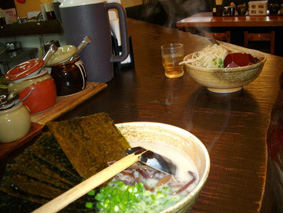 ステージチェンジの間に昼食です。時間がかからず食べられるということで、ここ数年はこの博多ラーメンです。
