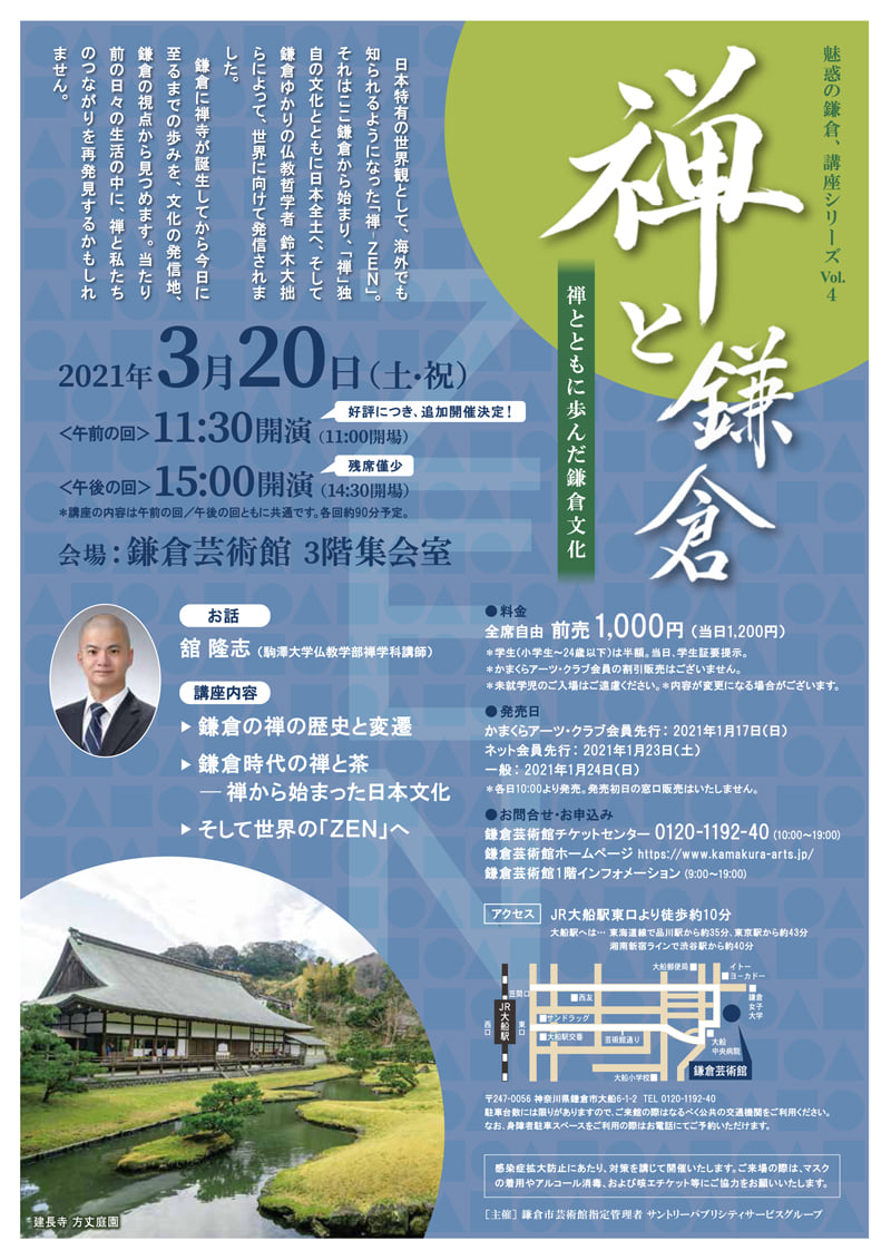 2021.3.20春の彼岸の中日。墓参りのあとで、【魅惑の鎌倉、講座シリーズ「禅と鎌倉」(鎌倉芸術館)】を聴講してきました。会場が家の近くであり、テーマも地元にちなんだものなので、チラシを見た時てすぐ申し込んだのですが、会場の方も予想外の反響と言っていたくらいの人気だったようです。講師の舘隆志さんは、父の田舎の菩提寺の副住職さん、母の葬儀をお願いした時、叔父や従兄弟の葬儀での会食時にも隣席し、とても興味深いお話を聞かせていただいていました。